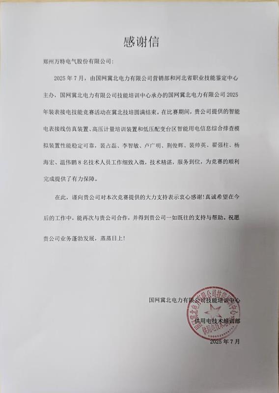 在剛剛結(jié)束的國網(wǎng)河南電力裝表接電及反竊電技能競賽和國網(wǎng)冀北電力聯(lián)合河北省職業(yè)技能鑒定中心主辦的裝表接電賽事中,面對分布式能源安裝、線損分析等復(fù)雜場景,公司設(shè)備全程穩(wěn)定運行,為大賽順利進行提供了關(guān)鍵技術(shù)保障。客戶分別在感謝信中強調(diào),我司派遣的技術(shù)人員“細致入微,技術(shù)精湛,服務(wù)到位”、“堅守崗位,保障賽事零故障”。