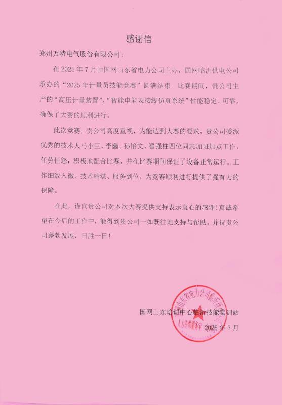 2025年7月,由國網(wǎng)山東省電力公司主辦、國網(wǎng)臨沂供電公司承辦的“2025年計(jì)量員技能競賽”在臨沂圓滿落幕。公司為本次競賽提供的競賽用產(chǎn)品憑借穩(wěn)定可靠的性能,保障了大賽的順利進(jìn)行,獲得主辦方高度評(píng)價(jià)。